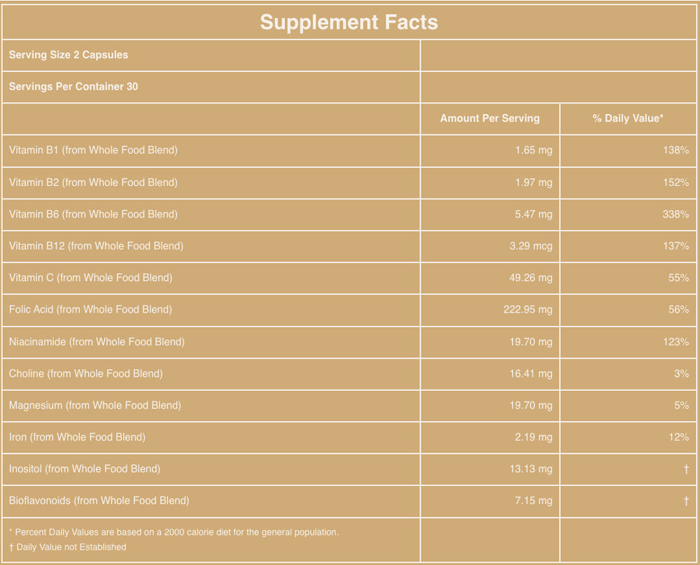 维生素 B 群在调节身体和精神健康方面发挥着关键作用。它负责支持能量生产、调节神经系统和帮助健康消化等基本过程。我们的配方是由100%全食物营养素混合设计的,以帮助你的身体更好地吸收。